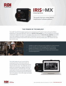The Iris MX™ from RDI Technologies expands upon its revolutionary Iris M™ product to open up the world of Motion Amplification® to high-speed applications. Like the Iris M, the Iris MX utilizes the millions of pixels in today’s modern cameras to measure deflection, displacement, movement, and vibration not visible to the human eye. The Iris M covers a wide range of faults in machine condition monitoring but with the addition of the Iris MX, we have you covered no matter what the speed of your machine.